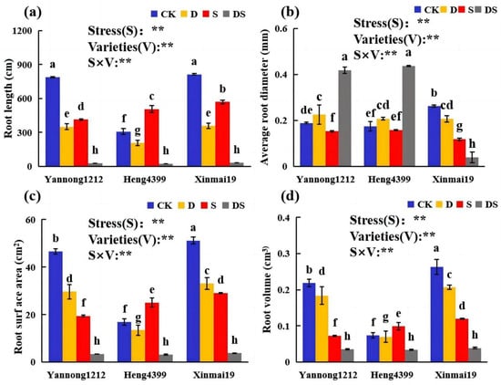 Effects of different stress treatments on wheat root length (a), average root diameter (b), root surface area (c), and root volume (d) of the different varieties. CK = control; D = PEG stress; S = NaCl stress; DS = coupled PEG and NaCl stress. The values are the means ± standard deviations (n = 3). Different lowercase letters indicate significant differences (p < 0.05). ANOVA was used to assess the stress (S), variety (V), and S × V. Stress: stress types; Variety: different varieties. ** indicates a significant difference at the level of p < 0.01.