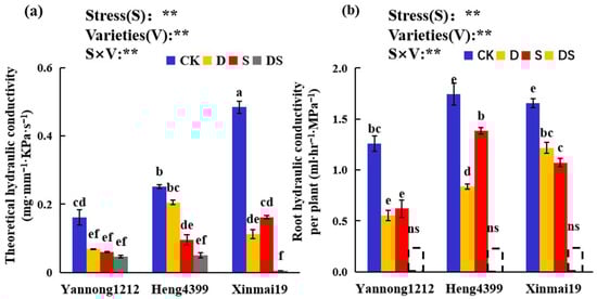 Effects of the different stress treatments on the theoretical hydraulic conductivity (a) and root hydraulic conductivity per plant (b) in the wheat seedlings. CK = control; D = PEG stress; S = NaCl stress; DS = coupled PEG and NaCl stress. The values are the means ± standard deviation (n = 3). Different lowercase letters indicate significant differences (p < 0.05); ns indicates that there was no significant difference. ANOVA was used to assess the stress (S), variety (V), and S × V. Stress: stress types, Varieties: different varieties. ** indicates a significant difference at the level of p < 0.01.