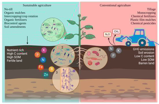 Tillage is a commonly used management practice for the containment of weeds, but it also plays a vital role in the even distribution of fertilizers and aeration in the soil. Conventional tillage (CT) is known to cause damage to soil aggregates and significantly alters the chemical properties of soil. This leads to reduced diversity and abundance of soil microbiota which in turn affect plant–root and plant–microbe interactions [14,15,16,17,18]. The Dust Bowl events in the US during the 1930s and in Canada between 1961 and 1990 serve as the most infamous examples of the consequences of extended tillage, which eventually caused wind-mediated soil erosion and resulted in nutrient-poor soils. To address these concerns, conservational agricultural practices, such as minimum tillage (MT) to no-tillage (NT), were implemented to minimize anthropogenic activities in farming and preserve microbial diversity and activity [19,20]. Compared to CT, both MT and NT have demonstrated positive outcomes, including enhanced colonization of arbuscular mycorrhiza that benefits plants through symbiotic associations, as well as increased soil carbon (C) and labile carbon, soil organic matter, soil moisture content, and microbial activity, fostering an intensified competition among soil microorganisms [21,22,23,24,25]. In addition, the adoption of long-term NT has been associated with increases in total nitrogen and available nitrogen compared to CT, as well as an augmentation of bacterial communities involved in nitrogen cycling [26,27]. For example, Alphaproteobacteria, Betaproteobacteria, and Bacteroidetes, comprised of plant growth promoting rhizobacteria (PGPR), were more abundant in NT as compared to CT [15,28,29]. Furthermore, compared to CT, soil bacterial communities under MT were significantly more diverse, and less conducive to the growth of Fusarium graminearum, a destructive pathogen of cereals, notably responsible for Fusarium crown rot or Fusarium head blight. These findings suggest that MT and/or NT can lead to increased soil fungistasis, although the direct impact on plant disease suppressiveness has not been thoroughly evaluated, limiting our ability to draw conclusive evidence on disease management [16,30]. Some studies have demonstrated that long-term NT or continuous application of MT can enhance soil suppressiveness in systems such as Pythium ultimum—Lepidium sativum (cress) and Fusarium graminearum—Triticum aestivum (wheat) [31,32]. However, other studies have found minimal influence of tillage practices on soil suppressiveness against Rhizoctonia solani and Streptomyces scabies in arable rotation systems in the Netherlands [33]. Moreover, NT coupled with other conservational agronomic practices, such as mulching, crop rotation, and the use of compost and organic fertilizers, often demonstrated effective suppression of diseases [34,35,36]. For instance, in minimum tilled fields cultivated in combination with crop rotation, suppression of take-all caused by Gaeumannomyces graminis var. tritici and Fusarium crown rot caused by Fusarium pseudograminearum and F. culmorum has been reported [36]. These examples highlight the potential of integrating multiple conservation practices to achieve enhanced disease management in agricultural systems.