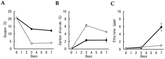 In the first experiment, the effect of the numbers of cut flowers on the gas concentration in polypropylene bags for MAP was investigated. The oxygen concentration in bags containing two and 10 cut flowers decreased after three days to approximately 13 and 4%, respectively (Figure 1A). Although carbon dioxide concentration increased to approximately 2.3% in three days in bags with two cut flowers, it increased to approximately 6% when 10 cut flowers were packed (Figure 1B). Ethylene concentration increased to approximately 6 ppm in seven days in bags with two cut flowers but was maintained at less than 1 ppm in bags with 10 cut flowers for seven days (Figure 1C).