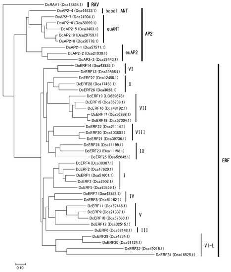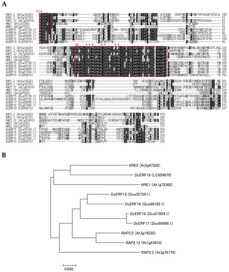 Homology searches were performed using the carnation genome database to identify the hypoxia-related genes. Considering that transcription factors containing the AP2/ERF domain are classified into three different lineages—AP2, RAV, and ERF—all members of the superfamily were phylogenetically confirmed simultaneously. As a result, thirty-two members of the ERF family were identified, together with nine members of the AP2 family and one RAV gene, and were named based on their subgrouping (Tables S1 and S2, Figure 5, Figures S2 and S3). Interestingly, carnation ERFs were classified into 10 of the 12 groups identified in Arabidopsis [18]. Groups II and Xb-L were completely absent, and only one member was found in group III. Five genes encoding group VII ERFs were identified, based on the presence of the MCGGAI/L motif. As the nucleotide sequence of Dca55626.1, deposited in the database, was incomplete, cDNA was cloned from two cultivars, and the whole coding sequence (CDS) was determined and named DcERF19 (accession nos. LC659678 and LC659682). The phylogenetic analysis of the deduced amino acid sequences showed that DcERF19 was closely related to Arabidopsis HREs (Figure 6). For PGB, only one sequence (Dca3435.1) that showed homology with PGB1 from Arabidopsis was found in the database (Figure S4). The cDNA sequences cloned from the two cultivars matched this reference sequence completely and were named DcPGB1 (accession nos. LC659679 and LC659683).