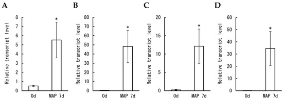 Effects of MAP on transcript levels of hypoxia-related genes in carnation petals. Relative transcript levels of DcSUS2 (A), DcADH1 (B), DcERF19 (C), and DcPGB1 (D) in petals before (stage 2) and after (stage 4) MAP storage for seven days were determined using real-time RT-PCR with DcUbq3-7 as a standard. Data are expressed as the mean ± SE of three separate samples. Significant differences (p < 0.05) detected using Student’s t-test are indicated by an asterisk above the bars.