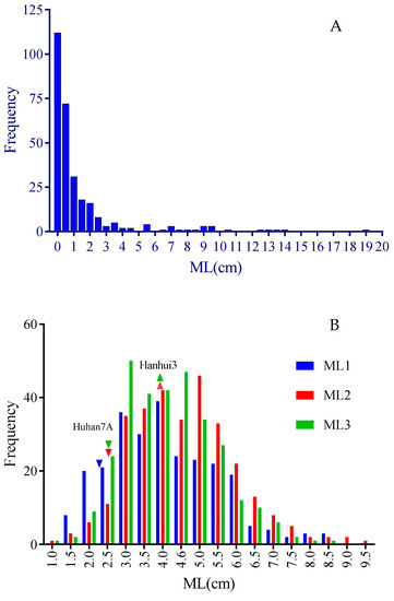 Frequency distribution of mesocotyl lengths measured in subsets of RDP1 (A) and HY73 RIL (B) populations. Downward and upward triangles represent the average MLs of Huhan 7A and Hanhui 3 (data missed in trial 1), respectively. ML1, ML2, and ML3 represent mesocotyl length measured in three successive trials.