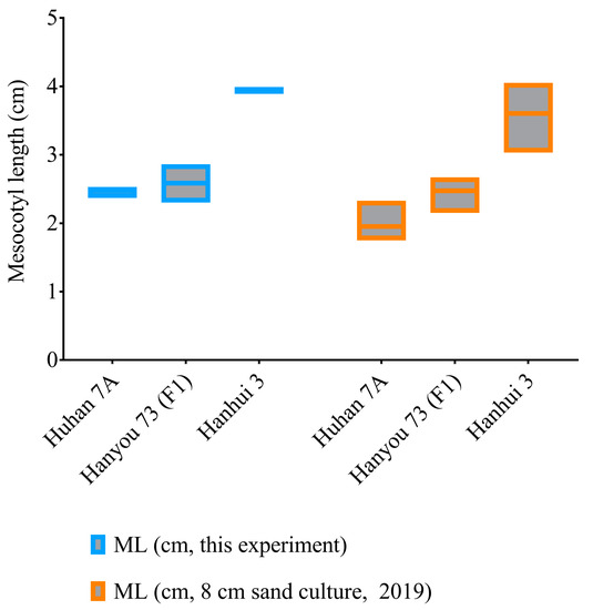 Mesocotyl lengths of the hybrid HY73 and two parental lines, Huhan 7A and Hanhui 3.