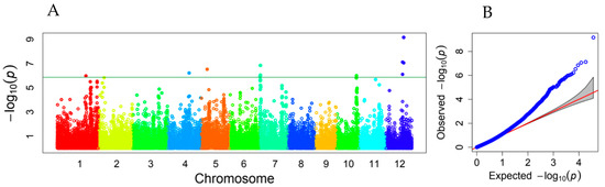 Manhattan plot (A) and QQ plot (B) showing associated loci for mesocotyl elongation identified in a subset of the RDP1 population. Varied colors represent different chromosomes. The horizontal line represents the threshold of −log10 (0.05/36901) = 5.868.