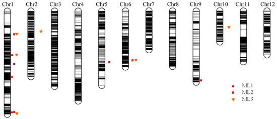 Using the phenotypic values measured in three successive trials (ML1, ML2, and ML3), four, five, and six QTLs were detected for the elongated mesocotyl length, respectively (Table 2), including three on chromosome 1 and one on chromosome 9 for ML1; three on chromosome 1 and one on each of chromosomes 5 and 6 for ML2; and three on chromosome 1 and one on each of chromosomes 2, 6, and 10 for ML3. Among them, two identical intervals, Chr1_bin348–Chr1_bin350 and Chr6_bin6431–Chr6_bin6433, were repeatedly mapped for ML1 and ML3 and ML2 and ML3, respectively. The superior allele of the QTL interval Chr1_bin348–Chr1_bin350 was derived from Hanhui 3, and the superior allele of the QTL interval Chr6_bin6431–Chr6_bin6433 was derived from Huhan 7A. The significant interval on chromosome 1 Chr1_bin147–Chr1_bin149 for ML2 was close to Chr1_bin140–Chr1_bin146 for ML3, and superior alleles were both derived from Hanhui 3. Three significant intervals, Chr1_bin1342–Chr1_bin1348 for ML1, Chr1_bin1322–Chr1_bin1327 for ML2, and Chr1_bin1396–Chr1_bin1398 for ML3, were located adjacent to one another on the end of chromosome 1 (Figure 4), of which the superior alleles were derived from Hanhui 3. The abovementioned colocated or adjacent QTLs had the same direction of additive effects (Table 2), suggesting one QTL for ML at each location.
