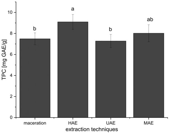 The results have shown that TPC was higher only in the extracts prepared using 70% ethanol in UAE compared to their parallels prepared in maceration (Table 1). The content of polyphenols was the same in the extracts after 15 min of UAE and after 30 min of maceration. Namely, as can be seen from Figure 1, the TPC values of the extracts obtained using UAE were not significantly different in comparison to maceration and MAE but were significantly lower than in the case of HAE.