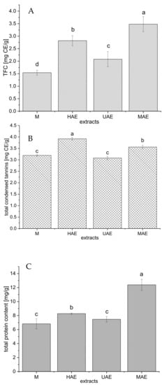 The total flavonoid (A), condensed tannin (B), and protein (C) contents of selected Aloe vera waste extracts prepared using maceration, heat-, ultrasound- and microwave-assisted extractions (M, HAE, UAE, and MAE, respectively); TFC, total flavonoid content; CE, catechin equivalent; values with the same letter showed no statistically significant difference (p > 0.05; n = 3; analysis of variance, Duncan’s post hoc test).