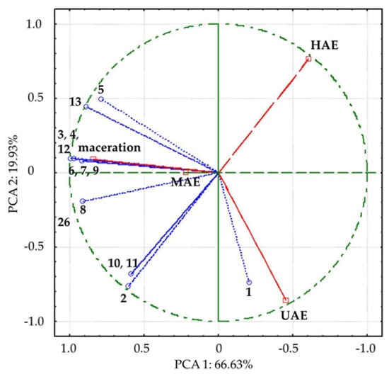 In PCA, all detected compounds correlated with variance, contributing to different positions of investigated extracts, i.e., the extracts obtained in UAE and HAE spatial separation from macerate and MAE extract by first axis (PCA1), along with the separation of UAE extract by second axis (Figure 4). The compounds 3, 4, 8, 12, and 13, which mostly contributed to the first axis, were remarkably positively correlated (0.90 to 1.00) with factor 1, while 1, 2, 10, and 11 were highly negatively correlated (−0.70 to −0.79) with the second axis.