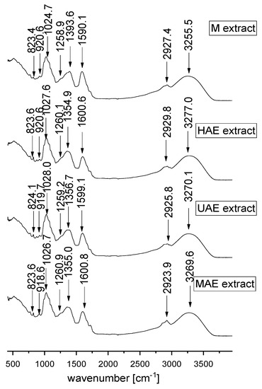 FT-IR represents a valuable tool for the characterization and identification of compounds or functional groups in an unknown mixture of plant extract. Since FT-IR spectra of pure compounds are unique, as a molecular “fingerprint”, the most common plant components in an unknown mixture can be identified by comparison to a library of known compounds. In the present study, FT-IR analysis was also performed in order to examine the influence of different extraction techniques on the chemical characteristics of selected A. vera waste extracts. FT-IR spectra of lyophilized extracts are presented in Figure 5.