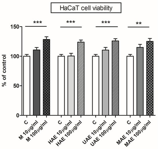 The influence of Aloe vera leaf waste extracts prepared using maceration, heat-, ultrasound- and microwave-assisted extractions (M, HAE, UAE, and MAE, respectively) on HaCaT cell (immortalized human keratinocytes) viability; ** p < 0.01, *** p < 0.001.