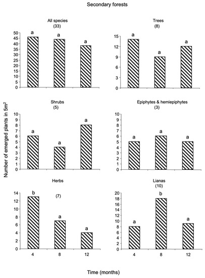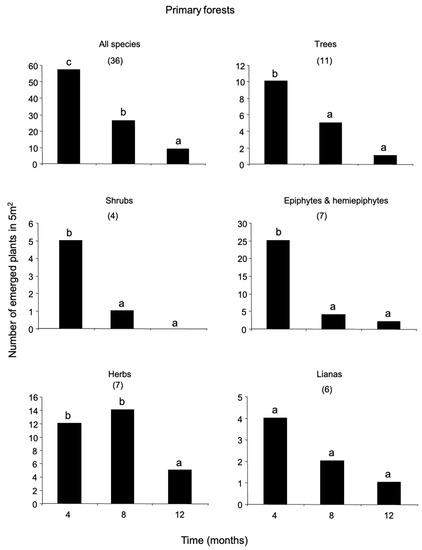 Seed densities were estimated from the number of plants emerged within the 60 0.25 m2 plots. Emergence (in-growth of new plants) was recorded in all plots every four months over one-year (Figure 4). For each inventory, every newly emerged plant was labelled, identified to the lowest possible taxonomic group, and classified into different growth-forms: trees, shrubs, palms, herbs (terrestrial individuals including Pteridophyta), woody lianas and epiphytes and hemi-epiphytes, and identified them to the lowest possible taxonomic group. I pooled epiphytes and hemi-epiphytes (hereafter referred as EH) because some species (i.e., Anthurium flexile, Philodendron inacuelaterum, Syngonium podophyllum) have shown to change in growth habit depending on habitat and ontogeny. In the case of grasses and sedges, only when an entire tussock fell inside the plots, it was counted as an individual [4]. It is likely that this method underestimates true seed-bank size, especially for those species that require high light levels for germination and establishment and for those that die between inventories that were inevitably lost in the census. It is very difficult to estimate the magnitude of this bias because the lifespan of new recruits is poorly understood.