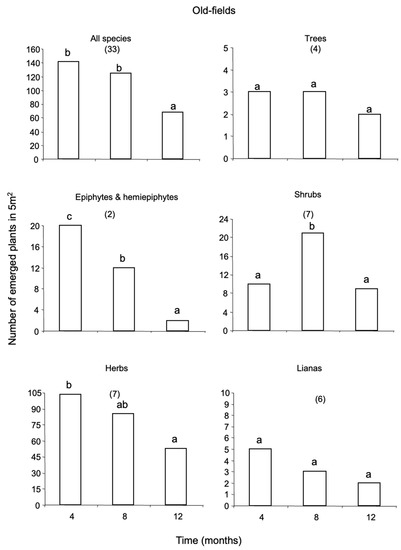 In total, 95 species were recorded from the seed-bank, of which 27 were herbaceous species; 23 were trees; 19 were lianas; 14 were shrubs; 11 were EH; and there was one palm species (Figure 1, Figure 2 and Figure 3; Table S1). The species richness of all growth-forms pooled was similar among habitats, with 35 species recorded in primary forests, 33 species in secondary forests and 37 species in old-fields. Thirty-three percent of the species emerged were exclusive to primary forests and old-fields; and 24% to secondary forests (Supplementary Material). Secondary forests shared 4.2% of the species with primary forests and 6.3 with old-fields; and no species was shared between primary forests and old-fields or among the three successional stages.