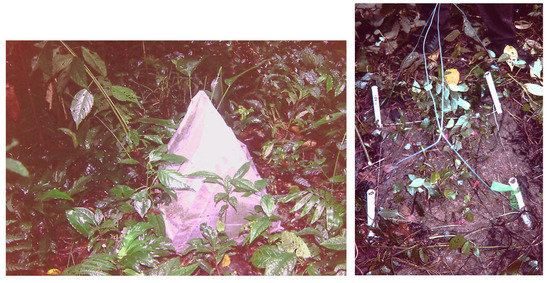 Experimental 25 cm2 plots, one covered with a transparent mesh to record plant recruitment from the soil seed-bank, exclusively. The other plot is uncovered to show the emerged plants. Plots were covered to record the recruited plants and classify them into different growth-forms and species. Meshed plots were used to exclude the seed-rain and to evaluate the contribution of the seed-bank to forest regeneration. Modified after [3].