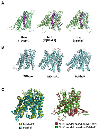 The first atomic structure of a cation–proton antiporter (CPA family) was the Na+/H+ exchanger of E. coli NhaA (EcNhaA). The structural map of EcNhaA resolved a characteristic folding of the active center, named the Nha-fold, consisting of two unwound transmembrane stretches that cross each other in the middle of the membrane near the ion-binding site by their unwound region, creating an X-shaped structure. Later, the structures of two CPA1 members, MjNhaP1 and PaNhaP, were also obtained. Although they contain some functional and structural differences to EcNhaA, the overall structure is well conserved, including the Nha-fold of the active center. The information gained from these structures allowed for the in silico modeling and helped to obtain a better understanding of the architecture of the more complex eukaryotic CPA proteins, such as plant proteins Populus euphratica PeNHX3 [7], and of A. thaliana AtCHX17 [8] and AtNHX6 [9]. Most models were based on the first available structure, that of EcNhaA, even if it was not the most adequate model, since EcNhaA is a CPA2 protein. In our work, three structures available at the SwissModel database were selected as templates because they best fitted the AtNHX1 protein sequence. These templates were Methanococcus jannichii NhaP1 (MjNhaP1), Pyrococcus abysii NhaP (PaNhaP), and Thermus thermophilus NapA (TtNapA). The alignment of the primary sequence of AtNHX1 with each of these three proteins individually and the alignment of all proteins together evidenced the high conservation of the core structure of the family.