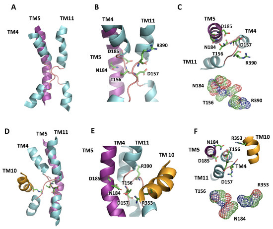 Integrating the primary sequence comparisons and the topological and ternary models, several residues with probable structural and functional significance were detected. The graphical representation of the TM segments in which these residues are located made evident that AtNHX1 present with an Nha-fold at the active center, as previously demonstrated for crystalized proteins of the CPA superfamily. The active center N184-D185 motif of the CPA1 electroneutral proteins is located in TM5 of AtNHX1. In the vicinity of the ND motif, the expanded sectors of TM4 and TM11 cross each other, and in these sectors, the conserved T156-D157 (TD-motif) of TM4 and R390 of TM11 are located. Moreover, TM10 is present in the surrounding Nha-fold, and the conserved R353 in this TM interacts with conserved residues in TM4 and TM11 (Figure 3 and Figure S2).