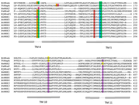 Alignment of AtNHX1 sequence with prokaryotic templates. Sequence alignment of CPA1 and CPA2 proteins cited here. The most relevant conserved amino acids and the TM segments in which they are located are highlighted with different colors according to their side chain group. TM numeration is in accordance with the topological model of AtNHX1 shown in Figure 1.