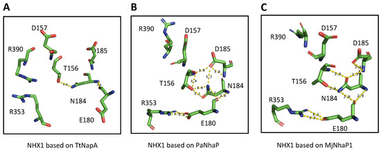 In EcNhaA, the conserved residues T132 and D133 (TD-motif) are involved in the ion coordination and translocation, but they are not essential for protein activity [27,43]. Instead, a function in the stabilization of the active site was proposed [27] and recently confirmed [44]. In the archea proteins PaNhaP and MjNhaP1, the TD motif is conserved and is essential to the coordination of the ion [12,23]. In PaNhaP and MjNhaP1 residues, Thr129 and Thr131 have been described to interact through their side chain with N158 and N160, respectively, which do not participate in the ion coordination but control the access to the ion-binding site. In the mammalian NHE1 and NHA2, and in TtNapA, this TD-motif is not conserved. Although, for PeNHX3, only the presence of a non-charged Tyr in position 149 was described [7], the alignment of the CPA proteins performed herein indicates that the TD motif is, in fact, conserved (Figure 4). This motif is also conserved in AtNHX1 (T156-D157) and, according to all the models obtained for AtNHX1, there seems to be an interaction of T156 with N184, as described for the archea NhaP proteins. Our yeast complementation assays showed that D157 of the TD motif is essential to AtNHX1 activity, but no mutant in T156 was tested.