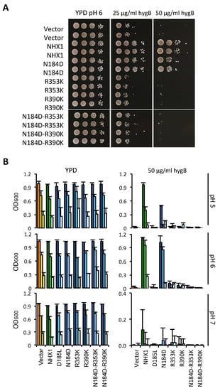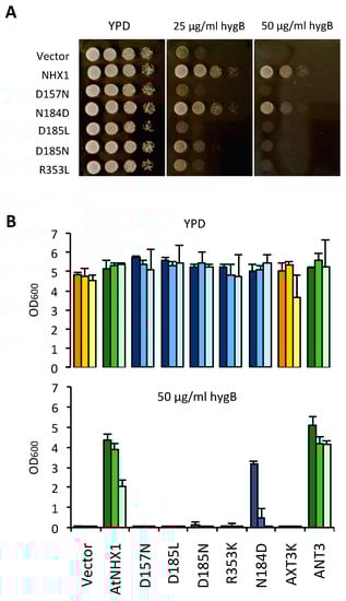 The wild-type AtNHX1 and the mutant alleles were cloned in the yeast expression vector pDR195 and transformed in the yeast strain AXT3K to test the functionality of the mutant proteins in both solid and liquid media. Plasmid pDR195 carries the strong and mostly constitutive PMA1 gene promoter to drive the expression of the recombinant protein. The expression of wild-type AtNHX1 improved AXT3K growth in the presence of 50 µg/mL of HygB (Figure 6). Cells transformed with the mutant alleles of AtNHX1 showed different phenotypes. The mutation of the D185 residue to Leu or Asn (D185L/N) generated non-functional proteins, as expected. Other mutations of residues at the core of the active center of the protein that are part of the Nha-fold (D157N, R353L) generated equally inactive proteins (Figure 6). These results indicate that the conserved residues of the active core in AtNHX1 have an important functional and/or structural role in the protein, and they are essential for protein activity under the tested conditions. Notably, the mutation in which Asp substituted for N184 (N184D) in the active center partly suppressed the sensitivity to HygB (Figure 6). This unexpected result implies that the highly conserved residue N184 is important but not essential for activity.