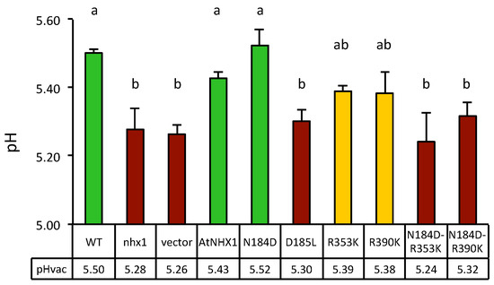 Vacuolar pH measured by BCECF-AM fluorescence in yeast expressing the AtNHX1 mutants. Vacuolar pH of the wild-type (WT) and mutant nhx1 strains, and of nhx1 cells expressing the plant exchanger AtNHX1 and the indicated mutant alleles, or transformed with an empty vector as negative control. Three independent transformants with 1–2 technical replicas (n = 5) were used for each determination. Shown are the means and SE. Lower row provides the actual mean values of pHv for each genotype. Different letters indicate statistically significant differences by Fisher LSD test (p < 0.01). The color code illustrates the three statistical groups (green, wild-type values; magenta, inactive mutant values; yellow, intermediate values). The experiment was repeated twice with similar results.