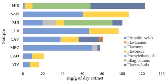 When evaluating the quantification of total phenolic compounds, the highest concentrations obtained were for HIR (123 ± 2 mg/g extract), SAN (106 ± 2 mg/g extract) and RUI (100 ± 2 mg/g extract), as observed in Figure 1.