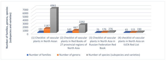 Quantitative statistics on numbers of families, genera, and species (subspecies and varieties) included in the (1) checklist of vascular plants in North Asia [39], (2) checklist of vascular plants in Red Books of 27 provincial regions of North Asia, (3) checklist of vascular plants in North Asia in Russian Federation Red Data Book, and (4) checklist of vascular plants in North Asia on IUCN Red List.