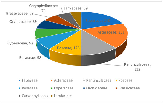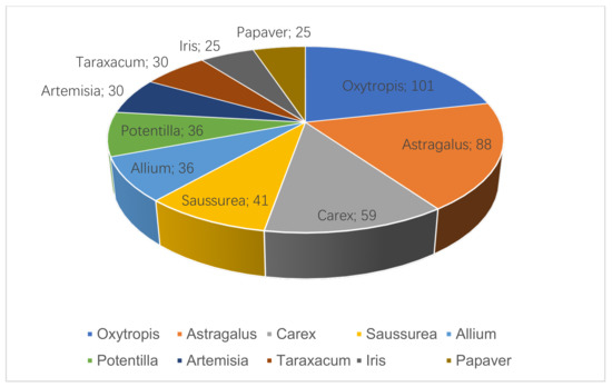 The results (a total of 2292 taxa) indicate that in terms of family classification, Fabaceae, Asteraceae, and Ranunculaceae ranked in the top three (Figure 2). In terms of genus classification, Oxytropis, Astragalus (both in Fabaceae), and Carex (Cyperaceae) ranked in the top three (Figure 3).