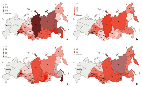 North Asia is a vast area of more than 13 million km2, or approximately 77% of Russia’s territory. In the west, the border runs mainly along the middle of the Ural Mountains, separating the European and Asian parts of the Russian Federation. The northern and eastern boundaries are bounded by the Arctic and Pacific Oceans. Along the southern border, the region shares borders with Kazakhstan, Mongolia, the People’s Republic of China, and North Korea. North Asia includes the Ural Federal District, the Siberian Federal District, and the Far Eastern Federal District, with a total of 27 provincial administrative regions (Table 1).