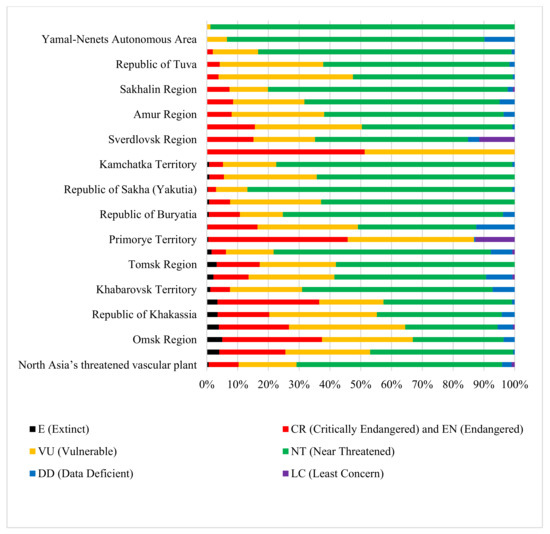 Quantitative statistics for categories of threatened vascular plants in 27 provincial distribution regions of North Asia.