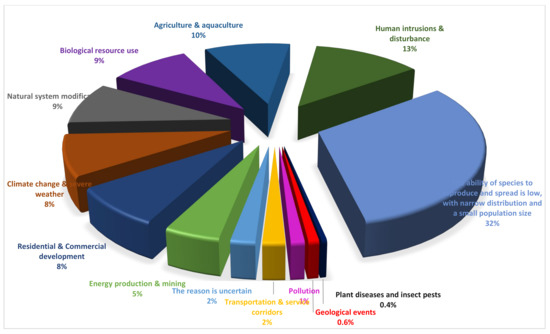 Based on the descriptions in the Red Book, we conducted incomplete statistics on the influencing factors of the 2292 threatened species, which mainly include 12 types: residential and commercial development, agriculture and aquaculture, energy production and mining, transportation and service corridors, biological resource use, human intrusion and disturbance, natural system modifications, plant diseases and insect pests, geological events, climate change and severe weather, and low ability of species to reproduce and spread, with narrow distribution. We counted a total of 6679 items of risk factor data, and their proportions are shown in Figure 6. Among them, the share of external risk factors, such as human activities and natural disasters, is about 66%, while the share of risk factors caused by the inherent biological characteristics and ecological habits of species is about 32% (Figure 6).