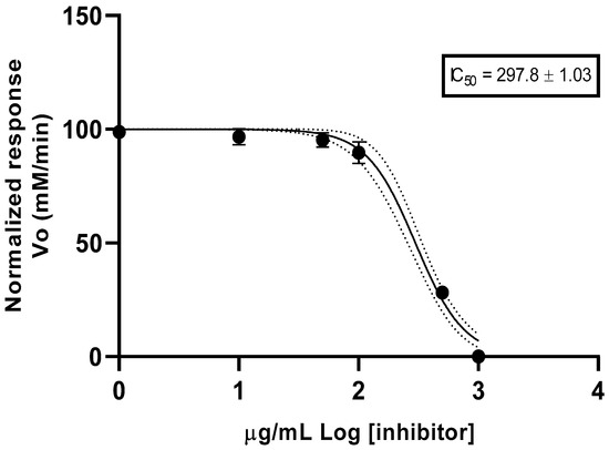 The spectrophotometric method was used to determine the anticholinesterase (anti-AChE) activity. The IC50 (half-maximal inhibitory concentration) value was measured from the corresponding rate of the reaction curve (Figure 1). The EO exhibited an IC50 value of 297.8 ± 1.03 µg/mL and donepezil (positive control) reported an IC50 value of 12.40 ± 1.35 µg/mL.