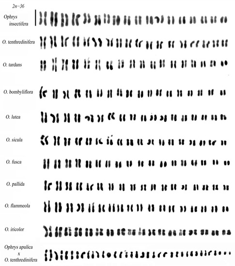 - D’Emerico, S.; Pignone, D.; Bartolo, G.; Pulvirenti, S.; Terrasi, C.; Stuto, S.; Scrugli, A. Karyomorphology, heterochromatic patterns and evolution in the genus Ophrys (Orchidaceae). Bot. J. Linn. Soc. 2005, 148, 87–99. [Google Scholar] [CrossRef][Green Version]