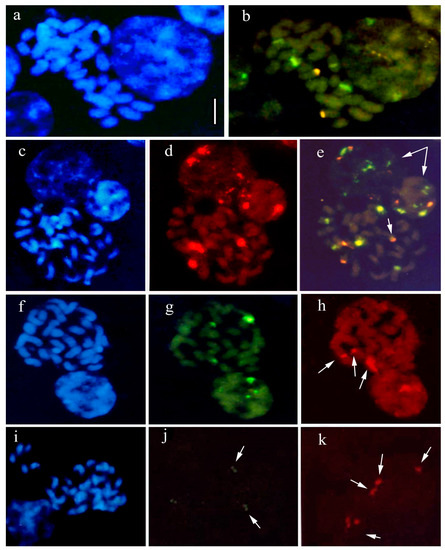 In situ hybridization is applied to the chromosomes of orchid species. Blue DAPI staining shows chromosomal DNA (a,c,f,i), respectively, in Anacamptis papilionacea (a,c), A. × gennarii (f), and A. collina (i). Red and green signals show sites of hybridization of 18S-25S rDNA and 5S rDNA, respectively (b,d,e,g,h,j,k): A. papilionacea (b) two 18S-25S rDNA sites and four 5S rDNA sites; A. papilionacea (d,e) three 18S-25S rDNA sites and five 5S rDNA sites; (e) long arrows indicate interphase nuclei sites; and a short arrow indicates one 5S rDNA site adjacent to the 18S-25S rDNA site; A. × gennarii (g,h) three 18S-25S rDNA sites; and three 5S rDNA sites, (h) arrows indicate 18S-25S rDNA sites; A. collina (j,k) three 18S-25S rDNA sites and two 5S rDNA sites, long arrows indicate 5S rDNA and 18S-25S rDNA sites; respectively, (k) short arrow indicate interphase nucleus sites. Scale bar = 5 µm.