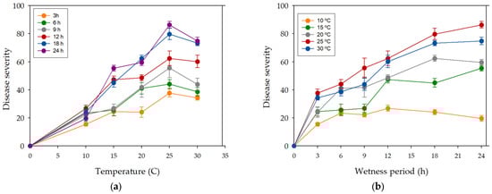 A short wetness duration period (3 h) resulted in low disease severity, up to 20 at temperatures from 10 °C to 20 °C and from 30 to 40 at 25 °C and 30 °C. Disease severity of plants incubated above 10 °C increased with increasing wetness duration. Maximum disease severity at 15 °C was observed at 24 h wetness. Similarly, at higher temperatures (20 °C, 25 °C and 30 °C), disease severity increased progressively when increasing the wetness period duration, from 40 at 6 h wetness to 60~70 at 18–24 h wetness (20 and 30 °C) and to 86 at 24 h wetness (25 °C) (Figure 4a). Six- to nine-hour wetness duration was enough for X. arboricola pv. juglandis to produce moderate disease severity (50) in plants incubated at 25 °C, whereas 12 h of wetness were needed at 15 °C, 20 °C, and 30 °C (Figure 4b). Disease severity in walnut plants incubated at 20 °C and 30 °C under 18–24 h continuous wetness was lower than disease severity in plants incubated at 25 °C. In conclusion, wetness was required for infection of walnut by X. arboricola pv. juglandis, and disease severity was affected by temperature during the wetness period.
