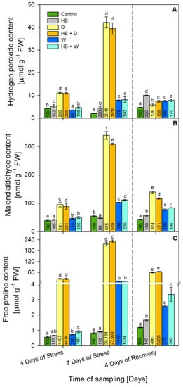 The herbicide induced moderate alterations in MDA concentrations (Figure 1B): a reduction by 10% (at the 7th day of stress) and an increment of 30% at recovery. Drought applied alone or in combination with herbicide (HB + D) increased considerably MDA levels: by 525% (339.3 nmol g−1 FW after drought), by 470% (309.4 nmol g−1 FW after H + D) at the 7th day of stress, by 224% (139.5 nmol g−1 FW after drought) and by 171% (116.6 nmol g−1 FW after H + D) at recovery. Waterlogging had a weaker effect than drought: MDA concentrations rose to 90% at the 7th day of stress and by 80% at recovery. Combined stress (HB + W) altered the MDA levels similarly to waterlogging alone.