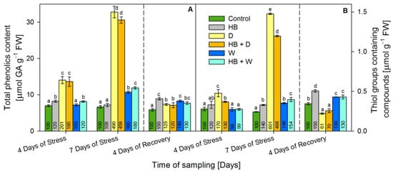 Serrate® increased thiols by 40% at the 7th day of stress and by 50% (at the 4th day of recovery above the respective control (Figure 2B). Thiol levels raised during drought treatment by 70% at the 4th day of stress and by 500% at the 7th day of stress, but at recovery, a decline by 40% below the respective control was observed. A similar tendency was found due to the combined treatment (HB + D): an increase by 30% and 400% at the 4th and 7th days of stress, respectively, and a decrease by 30% at recovery. Waterlogging and combined treatment (HB + W) increased thiol groups containing compounds by approximately 50% at the 7th day of stress and by 30% at recovery above the respective control.