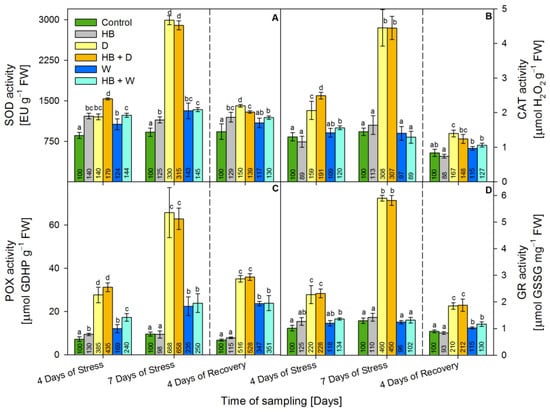 Activity of superoxide dismutase (SOD) (A), catalase (CAT) (B), guaiacol peroxidase (POX) (C), and glutathione reductase (GR) (D) in the leaves of triticale treated with selective herbicide (HB) and exposed to waterlogging (W) or drought (D). The numbers in each bar represent % to the respective controls. The statistical significance between treatments at p ≤ 0.05 is indicated by different small letters within the column groups.