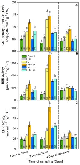 Serrate® led to a temporary induction (by 40%) of Cytochrome b5 reductase (B5R) activity only at the 4th day of stress (Figure 4B). Drought increased substantially the activity of B5R by 439% at the 7th day of stress and reverted the activity to 30% over the control at the recovery. The combined treatment (HB + D) further raised B5R activity by 290% at the 4th day of stress, by 670% at the 7th day of stress, but at recovery reverted it to 20% above the control.