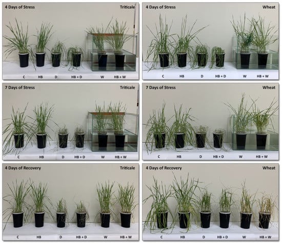 Drought boosted the oxidative stress markers more dramatically than waterlogging and kept that tendency at recovery, pointing to the higher susceptibility of triticale to a water deficit than to waterlogging. Earlier, we reported an opposite effect for wheat plants—waterlogged seedlings were unable to recover at the monitored recovery period, whereas those subjected to drought could recover [,,]. These observations are also well illustrated by the phenotype alterations of triticale as compared to wheat [] (Figure 5).