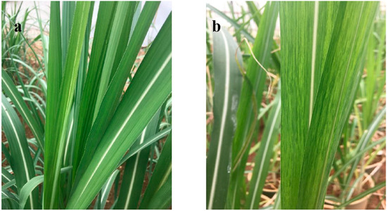 Symptoms of sugarcane mosaic disease in different varieties of sugarcane in Yunnan Province, China. From left to right, varieties are CP94-1100 (a), and ROC22 (b).