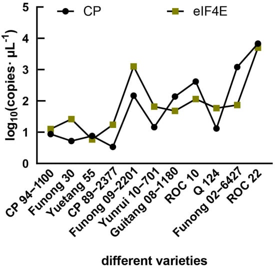 The standard curve for detecting eIF4E accumulation was Y = 2.2802X + 24.615, R2 ≥ 0.994, E ≥ 1.03%. It met the requirements of an ideal standard curve (R2 ≥ 0.98, 85% ≤ E ≤ 110) [15]. RT-qPCR showed the accumulation of eIF4E in susceptible varieties was greater than that in resistant varieties. The accumulation of eIF4E was the least in CP94-1100 and the most in ROC22 (Figure 2).