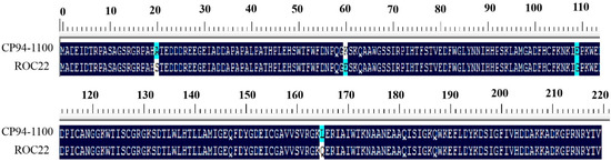SCSMV was found in different resistant sugarcane varieties (CP94-1100 and ROC22) through the detection of the SCSMV-CP and SCSMV-VPg, indicating that both varieties were infected by SCSMV. Two SCSMV-CP sequences obtained using RT-PCR were submitted to the GenBank database with the accession numbers ON505212 (CP94-1100) and ON505213 (ROC22). The sequence length was 938 bp, and the homologies with the published SCSMV-CP sequence (accession number JF488065) were 99.9% and 99.6%, respectively. The nucleotide sequence and coding proteins were basically the same. The SCSMV-VPg sequences were submitted to the GenBank database with the accession numbers MZ605863 and MZ605884 for CP94-1100 and ROC22, respectively. The sequence length of SCSMV-VPg was 594 bp, and the homologies were 99.7% and 99.0% with the published gene sequence of SCSMV-VPg (accession number JF488065). The nucleotide sequence and coding protein were basically the same (Table 2), indicating that the SCSMV isolates of the two varieties were the same. The differences in the symptoms in sugarcane were attributed to the differences in sugarcane varieties.