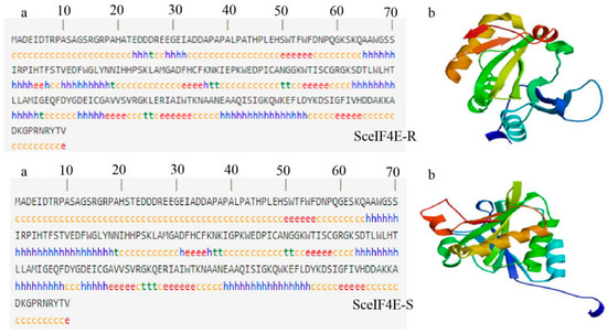 Bioinformatic analysis of the eIF4E sequences of two sugarcane varieties with different levels of resistance (CP94-1100 and ROC22) showed that there were base differences between the two varieties at 60 bp, 180 bp, 328 bp, 383 bp, 496 bp, and 661 bp in the ORF region. Of these, four sites, 60 bp, 180 bp, 328 bp, and 496 bp, led to the missense mutation of amino acids (Figure 3). These results indicate that the protein character differed between the varieties. The physicochemical properties of the proteins encoded by SceIF4E-R and SceIF4E-S were predicted online. The results show that the molecular formulas of SceIF4E-R and SceIF4E-S were C1093H1652N306O328S7 and C1092H1649N307O330S7, respectively. The relative molecular weights were 24.55 kDa and 24.58 kDa, respectively. The theoretical isoelectric points were 5.70 for both, and the instability coefficients were 29.95 and 32.29, respectively. The total average hydrophilicity values were −0.617 and −0.662, respectively, indicating that both proteins were stable and hydrophilic. The SceIF4E-R and SceIF4E-S proteins were both present in the cytoplasm, which had no transmembrane structure and signal peptide. These results indicate that SceIF4E is neither a membrane protein nor a secretory protein (Figure 4). The results of protein secondary and tertiary structure prediction show that SueIF4E-R was composed of a random coil (53.18%), alpha-helix (28.18%), extension strand (14.55%), and bate turn (4.09%), while SceIF4E-S was composed of a random coil (50.45%), alpha-helix (28.64%), extension strand (16.36%), and bate turn (4.55%) (Figure 5). Conservative domain analysis showed that both SceIF4E-R and SceIF4E-S had an IF4E conserved domain, belonging to the IF4E family of proteins; however, SceIF4E-R also contained a CDC 33 or PTZ00040 domain (Figure 6). These domains suggested that SceIF4E-R and SceIF4E-S proteins had the same function as the IF4E family of proteins, but the functions of SceIF4E-R and SceIF4E-S proteins differed.