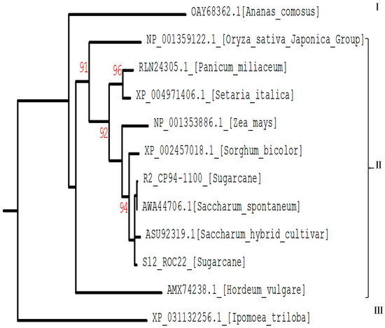 To further clarify the functions of SceIF4E-R and SceIF4E-S and understand their phylogenetic relationships with eIF4E genes in other plants, the amino acid sequences of eIF4E in 10 plants were downloaded from the NCBI database (https://www.ncbi.nlm.nih.gov/, accessed on 11 June 2022) for analysis and construction of the phylogenetic tree. The 10 plants were sugarcane (Saccharum hybrid cultivars), sorghum (Sorghum bicolor), maize (Zea mays), Chenopodium album (Panicum miliaceum), millet (Setaria italica), Saccharum spontaneum, rice (Oryza sativa), barley (Hordeum vulgare), pineapple (Ananas comosus), and sweet potato (Ipomoea triloba). The phylogenetic tree was divided into three groups. The first group contained only pineapple eIF4E. The second group included SceIF4E-R, SceIF4E-S, and the eIF4E of eight Gramineae plants. The third group contained sweet potato eIF4E (Figure 7). The phylogenetic tree showed that all SceIF4E clustered in the same branch, including the eIF4E of sugarcane (S. hybrid cultivar, ASU92319) and S. spontaneum (AWA44706), and SceIF4E-R had the closest genetic relationship with S. spontaneum (AWA44706).