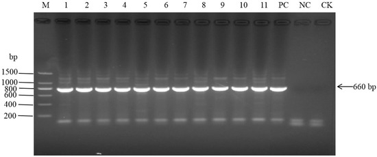 Detection of eIF4E1 by PCR in different sugarcane varieties. From left to right, marker (M), samples from Nos. 1–11 (Lanes 1–11), positive control (PC), negative control (NC), blank control (CK).
