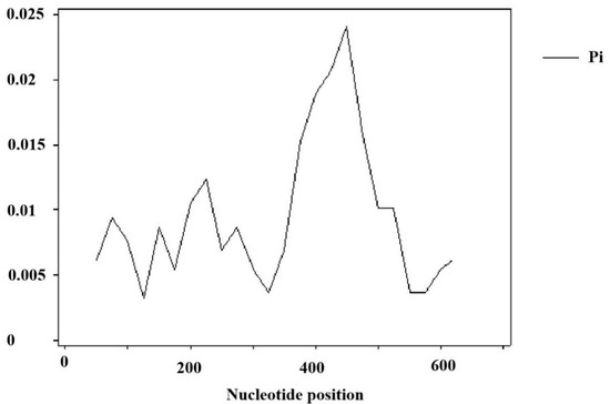 The distribution of polymorphic sites in the eIF4E nucleotide sequence of the tested materials is shown in Figure 9. There were multiple peaks in the previous sequence, indicating that there were many regions where the sequence changed and there may be multiple hot mutation sites. The peak appears in the region of about 400 bp, indicating that the region around 400 bp was the enrichment region of nucleotide change.