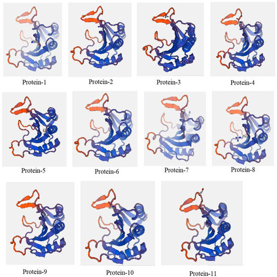 Wheat eIF4E protein (2idr.1.A) was selected as the model protein using SWISS-MODEL software to predict the spatial structures of 11 proteins encoded by eIF4E. The spatial structures of 11 proteins showed high similarity. Previous studies showed that the cap structure of eIF4E played an indispensable role in protein function [16,17]. The key regions of the cap structure are shown in the A and B regions of Figure 9. Region A is located in the 57–73 amino acid site range of eIF4E, and region B is located in the 107–118 amino acid site range. In this study, the amino acid variation sites, 58, 60, and 64 sites, were all located in region A. Of these, the 58 amino acid variation site was the variation site of all materials relative to the control sequence, KX757017. The 64 amino acid variation site was only found in Protein 3 encoded by the eIF4E gene of Yuetang 55, an extremely resistant material, and the amino acid variation was Ala64Val. The 60 amino acid variation site was only found in Protein 11 encoded by the eIF4E gene of ROC22, an extremely susceptible material, and the amino acid variation was Lys60Glu (Table 4 and Table 5, Figure 10).