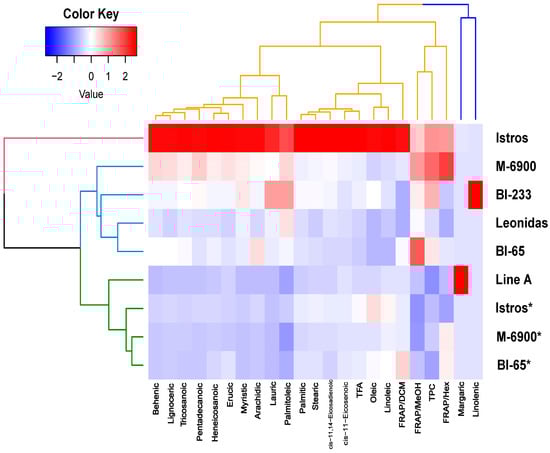 Heatmaps generated for each of the six Vicia sativa varieties, illustrating 23 characteristics related to phytochemicals and antioxidants. The color-coded scale is used to indicate an increase (red) and reduction (blue). For the varieties denoted by an asterisk (*), grain was used in the analysis, and biomass was also used for all six varieties. The quality traits and genotypes were subjected to hierarchical cluster analysis using the Ward’s method, and the resulting dendrograms visually display their relationships.