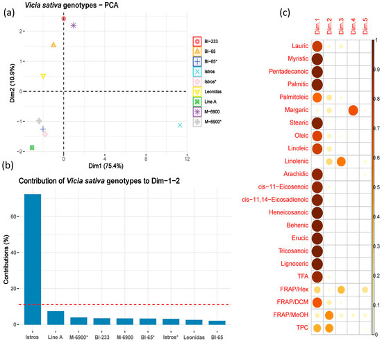 PCA results visualized graphically. (a) A plot with the percentage of the variation explained by the first two principal components (86.3%) and the contribution of the varieties to each dimension. (b) A bar plot depicting the contribution of the Vicia sativa varieties to the first two principal components. (c) A correlation plot that highlights the most contributing variables for each dimension. For the varieties denoted by an asterisk (*), grain was used in the analysis, and biomass was also used for all six varieties.