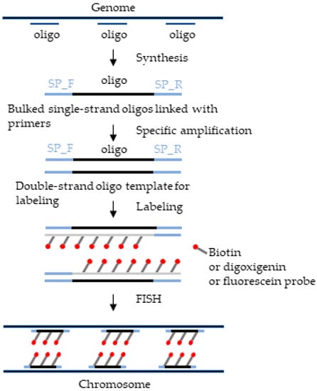 De novo oligo probe synthesis is a combined approach that starts with a computational search of single-copy potential oligos in the genome, and then sequential steps are performed. A method for de novo single-copy oligo probe synthesis is described in Figure 1 and Figure 2, which represent combined approaches of computational and experimental techniques. In brief, the process involves selecting potential single-copy oligos, synthesizing them, and labeling them with fluorescent markers [7,23]. However, first, single-copy oligos are computationally searched in the target genome, repetitive sequences are filtered out, and potential bulked oligos are selected using the Chorus2 platform (Figure 1). Next, the selected potential DNA sequences are bound with a specific pair of primers to their 3’ and 5’ ends for PCR amplification for transcription or reverse transcription for making a double strand, and then fluorescent markers are added (Biotin, digoxigenin or fluorescence probe) in wet-lab experiments [24] (Figure 2). Obtaining genomic data for oligo selection is possible through the genomic database, and the process has been greatly facilitated using next-generation sequencing (NGS) technology [1]. Depending on the purpose of the experiment, single-copy oligo sequences can be made into ‘oligo pool’ probes specific to any region of the chromosome [12,20]. The specificity of the probe is crucial for a single-copy oligo probe to determine the quality of the FISH experiment with specific FISH signals [25]. Therefore, selecting a well-assembled reference genome and suitable software or a suitable platform is essential to design an efficient single-copy oligo probe. It is important to follow other rules as well, such as maintaining a minimum space of typically 10 bases between probes to minimize overlapping between adjacent probes, maximize PCR quality, and minimize the mismatch ratio between the probe and target sequence [20]. For more information, Liu and Zhang (2021) [26] published a review article summarizing the various attributes of single-copy oligonucleotides and discussing comprehensive probe design platforms. The preparation process of oligo probes based on repetitive sequences is similar to that for single-copy sequences, with the main distinction being the filtering process of target sequences.